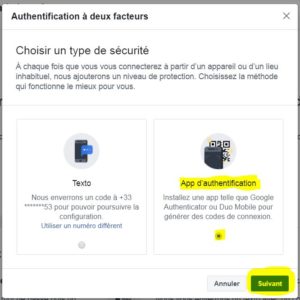 Choisissez le type de sécurité, nous allons choisir « App d’authentification » en cochant la case et en cliquant sur « Suivant » :