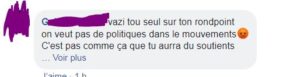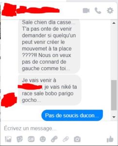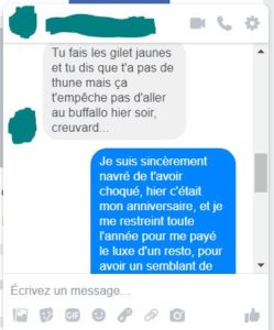 Énervé, je leur fais un message. En gros, je dit que ce n’est pas par ce qu’il y a quelques fauteurs de trouble qu’il faut abandonné, qu’il faut juste changer de place, choisir un autre rond-point, dire qu’on n’est pas avec eux, nous on est pacifiste !