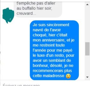 Je n’ai pas mis les captures car j’ai supprimé les messages puis après j’ai réfléchis ! Et puis, il s’est excusé !