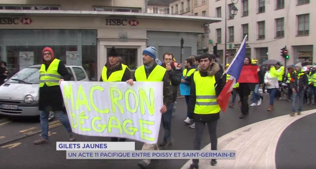 Une bonne centaine de gilets jaunes selon la journaliste de la Gazette, dont des responsables syndicaux à titre personnel, marchent dans Poissy avec dynamisme et donnent de la voix ! Encadrés par leur propre service de sécurité discipliné, les gilets jaunes distribuent leurs tracts à la population qui les encouragent et qui klaxonnent ! Rien d’une kermesse ou d’une procession, une marche combative et très déterminée réclamant la démission de Macron et l’instauration du RIC !!