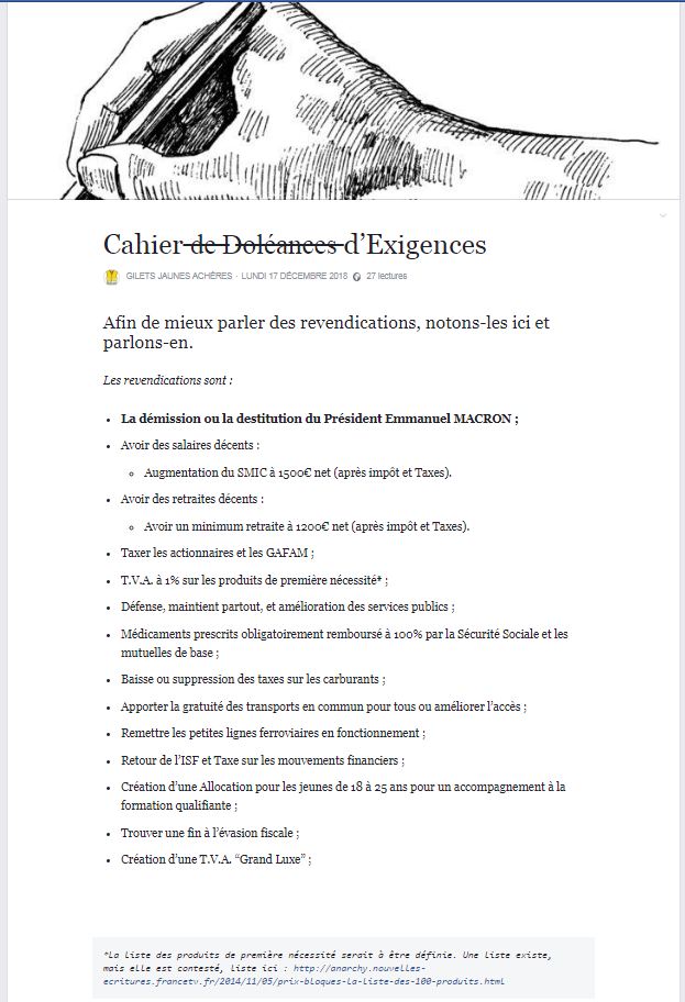 Et puis très rapidement, j’ai éteint BFMTV pour rechercher les réelles revendications des premiers Gilets Jaunes. Car oui, à la TV, on ne parlait que la revendication de la hausse du carburant, que c’était des citadins qui gueulait, et rien que ça, c’était bien trop gros pour prétendre à un 1789 bis repetita, non, il y avait d’autres choses, bien plus enfouis, d’autres revendications. BFM&Co. se sont bien gardés de ne pas révéler les autres revendications — sûrement insignifiantes pour eux — pour continuer à mettre en avant « l’unique » revendication… Et puis, de nombreuses personnes ont très certainement faites comme moi, on a toutes éteint BFMTV et cherché sur internet les raisons.