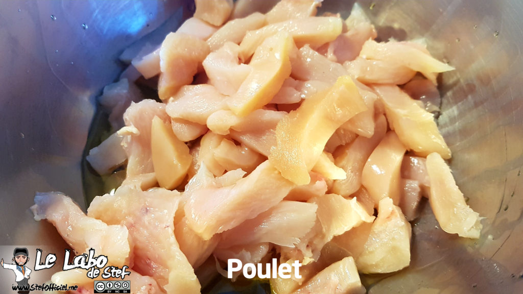 Sur les photos j’ai utilisé du poulet jaune, mais ça fonctionne tout aussi bien avec du poulet blanc.