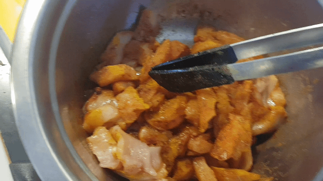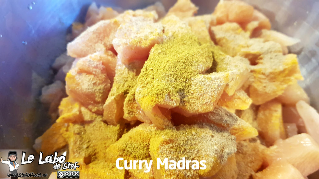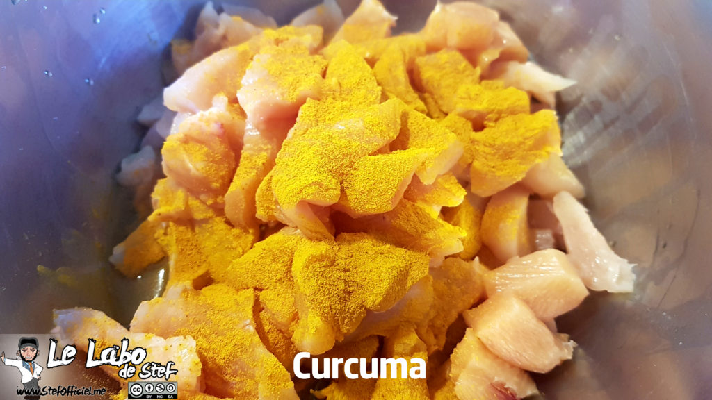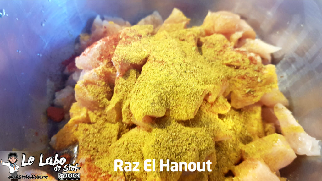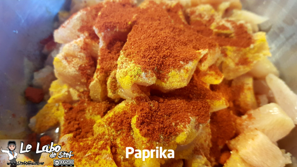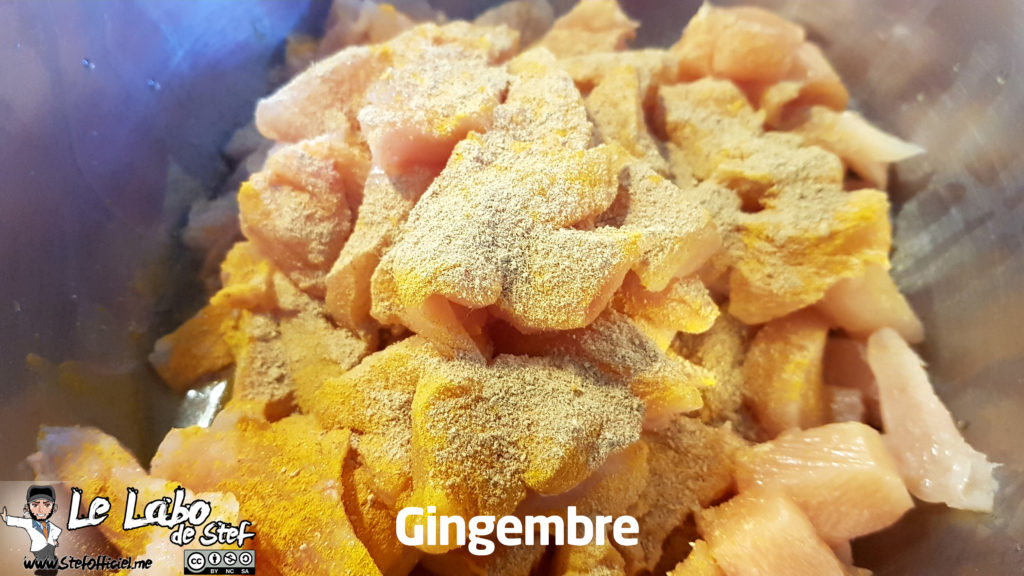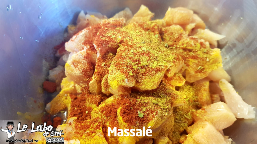 Une fois tout le poulet découpé, ajoutez les épices (l’ordre n’a pas d’importance) :