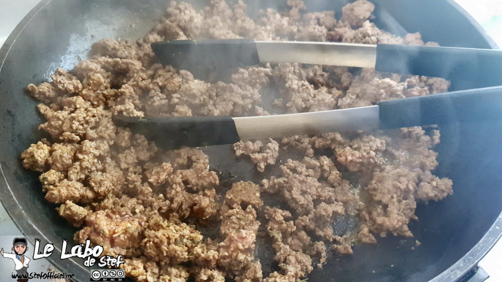 L’astuce : Ne déposez pas les viandes dans leurs poêles en attendant la fin de cuisson, pour le Bœuf haché, placez la viande dans la poêle, répartissez sur l’ensemble de la poêle et remuez et séparez la viande tout du long de la cuisson, à feu vif. Il faut impérativement éviter que de gros morceaux se forment.