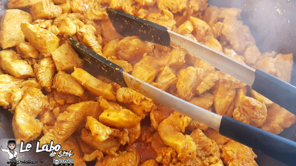 Pour le poulet, retournez régulièrement les morceaux à l’aide de la pince alimentaire ou bien en remuant le wok énergiquement, n’hésitez pas à égoutter avant la fin de cuisson, autant de fois que nécessaire, si votre viande rend de l’eau.