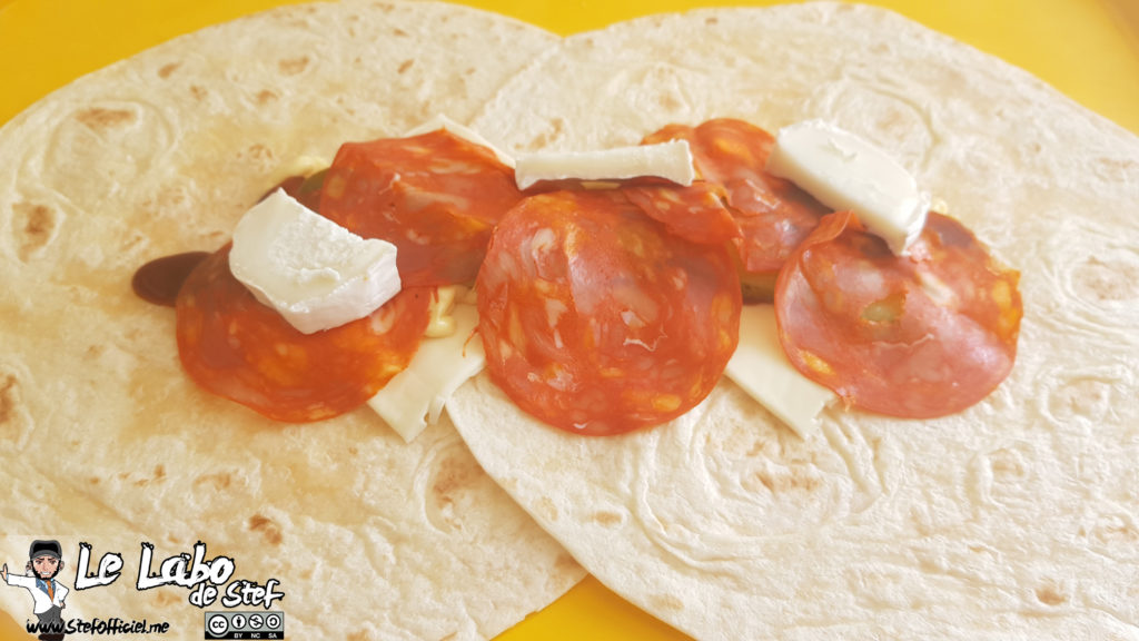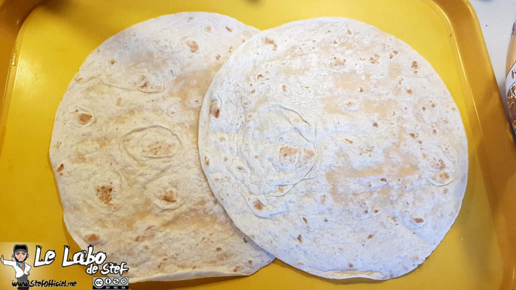 Nous allons donc créer le Tacos, prenez deux galettes de blé, disposez comme suit :