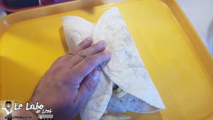 Tout en maintenant les deux cotés, attrapez la partie basse et roulez-le jusqu’à obtenir un Tacos bien ferme et bien fermé