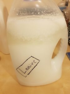 Ce qu’il faut se dire, c’est que le bidon doit être assez solide pour supporter 3L de Lessive en prenant en compte que cette recette durcît légèrement et qu’il y a besoin d’agiter avec énergie à chaque utilisation.