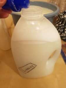 Pour ma part, mes 4L de lessives sont à mon gout trop concentrés, alors je les coupent avec 2 autres litres d’eau froide, ce qui me permet d’avoir deux bidons de 3L.